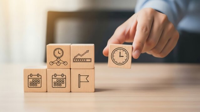 Strategic Timeline Planning. Wooden blocks with time and calendar icons, structured annual timeline management for business success.