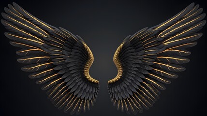 A stunning pair of black and gold angel wings set against a black background