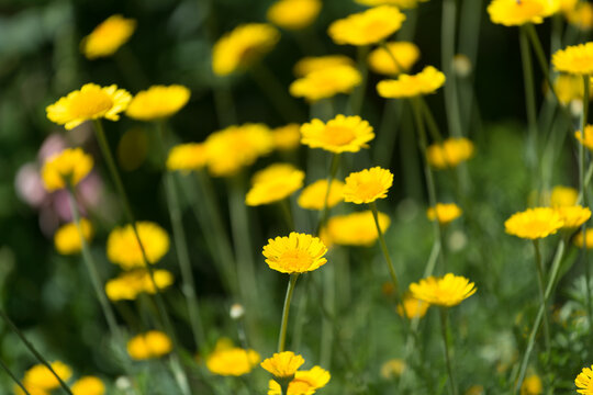 two yellow asters, with yellow flowers, in close-up in sunshine, in the background green plants and leaves
