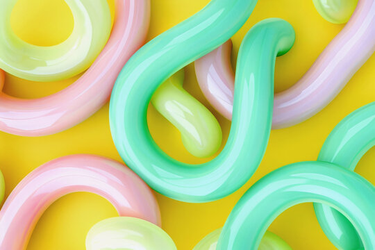 Abstract background of smooth swirled shapes in pastel colors on a bright yellow base