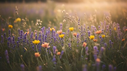 Serene field of purple lavender and yellow blossoms glowing under golden hour light