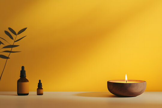 a candlelit room where essential oils have been used for a relaxing bath yellow background