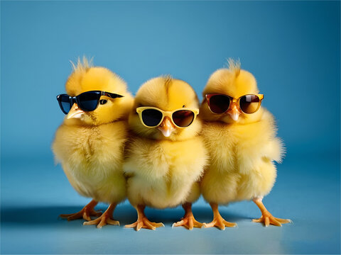 Cosmic chicken: fluffy yellow cartoon chicken wearing red sunglasses