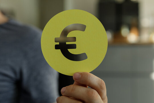Close-up of a hand holding a yellow circle with a euro symbol cut out.  Financial concept image.