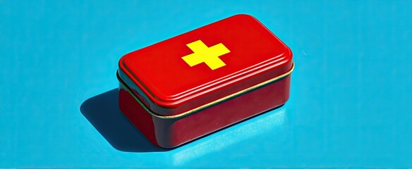 A red rectangular metal first-aid kit with a yellow cross sits on a bright blue background, casting a shadow