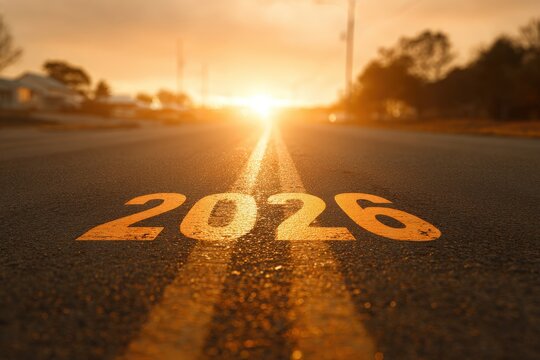 Yellow digits indicating the year twenty twenty six appear painted onto the asphalt surface of a road leading toward bright sunset light.