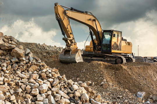 A large yellow excavator moving stone or soil in a quarry. Heavy construction hydraulic equipment. Excavation.