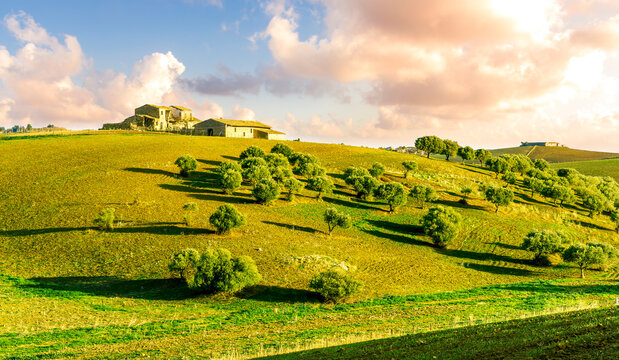 rustic landscape with summer or autumn farm field after crop harvesting. Farmland in countryside with green and yellow fields and beautiful clousy sky on background