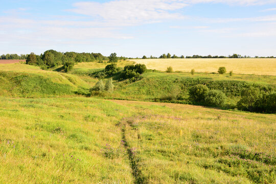 yellow Fields and Rolling Hills Under a Blue Sky and a path