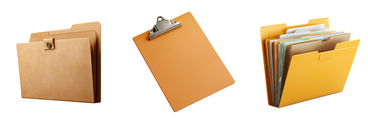 Three office supplies including a clipboard and two file folders isolated on a transparent background