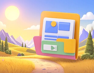 A vibrant, sunny landscape scene featuring a stylized, floating file folder with various documents, on a path towards mountains