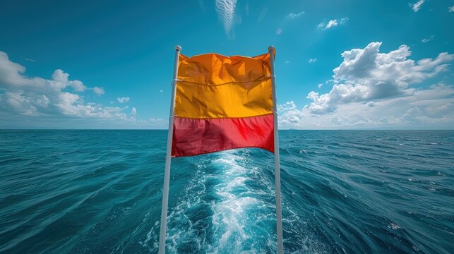 A yellow flag waving in the air on a cloudy day, ideal for use in weather or outdoor-themed projects