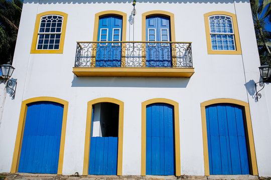 Front view of a typical white house facade with blue doors and windows with yellow frames on sunny day in historic town Paraty, Brazil, Unesco World Heritage