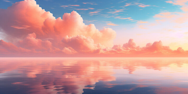 A banner with a beautiful peach fuzz orange and yellow color clouds above a blue smooth reflecting ocean. Sea and nature beauty. Copy space