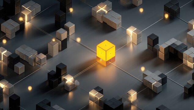 Glowing yellow cube amidst a scattered field of dark and light gray cubes on a dark grid;  small glowing points accentuate the scene
