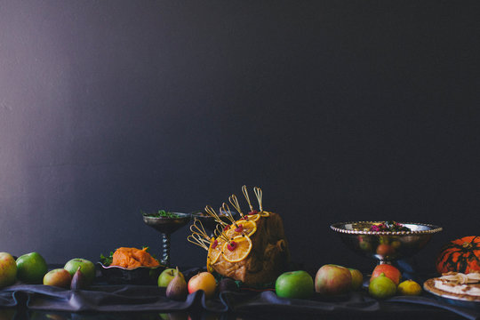Autumn harvest still life featuring pumpkins, round green squash, grapes, lemon, garlic