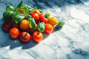 A cluster of ripe red and yellow tomatoes with fresh basil leaves rests on a marble surface, bathed in sunlight.