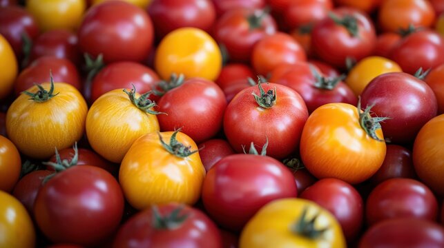 A vibrant arrangement of various tomato types, including Roma and grape tomatoes, on a soft beige background to accentuate their colors.