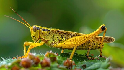Vibrant yellow grasshopper with intricate black markings rests on green foliage in soft natural light showcasing detailed insect anatomy and texture