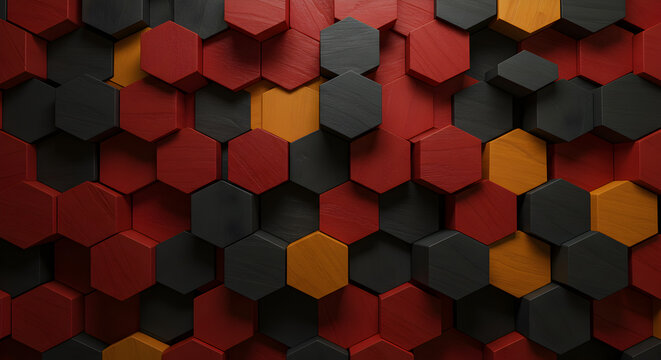 Wooden hexagons in red, black, and yellow create a geometric pattern