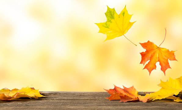 Minimal autumn flatlay featuring pumpkin gourds, dried leaves and negative space on yellow