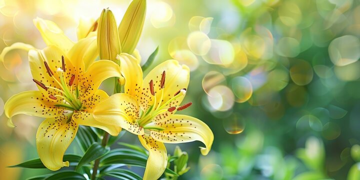 Blooming yellow lilies with speckled petals stand out against a soft focus greenery background