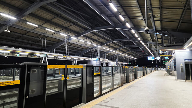 MRT Yellow Line train at Bangkok station platform, 18 Aug 2025. Bangkok. Thailand