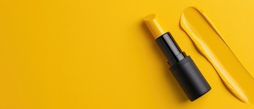 Yellow lipstick with a black tube on a vibrant yellow background, perfect for beauty and cosmetics themes.