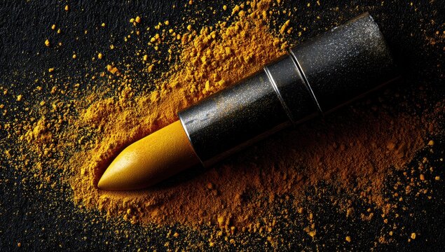 A close-up of a pale yellow lipstick nestled in a bed of turmeric powder on a dark surface