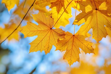 Golden yellow maple leaves on tree branches against a bright blue sky in sunny autumn day
