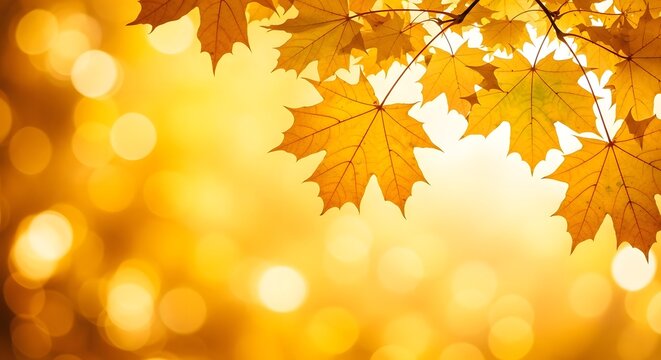 Closeup of vibrant orange and yellow maple leaves against a blurred golden bokeh background, capturing the essence of autumn