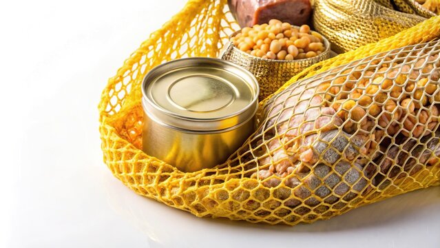 Canned meat and fish and cereals in packs in a yellow mesh bag on a white background Extreme Close-Up