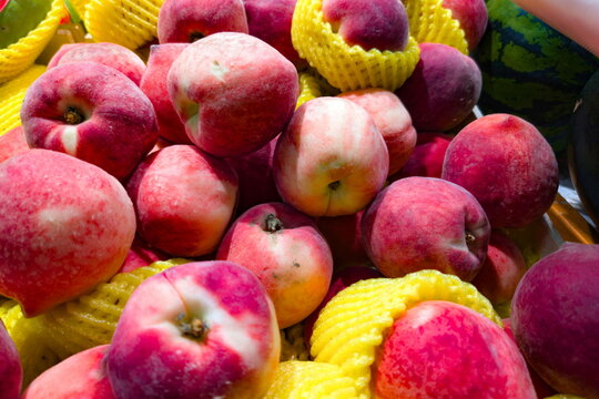 Colorful display of fresh peaches surrounded by vibrant yellow mesh in a market stall during the summer season
