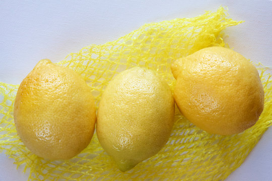 Lemons in a yellow mesh bag on a whitewashed wood background