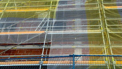 Scaffolding wrapped in ethereal yellow mesh, echoes urban renewal, St Barbara's Day, and whimsical construction tapestry