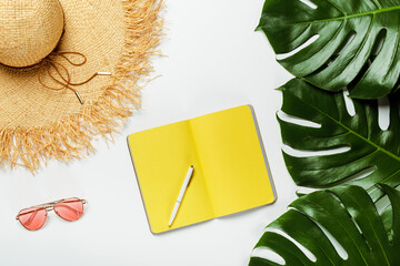 Creative monochrome flat lay of bloggers workspace. Top view of yellow notepad and pen. Yellow background, place for text.