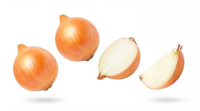 Fresh yellow onions and sliced halves creatively arranged in a studio against a clean white background, perfect for culinary and health content.