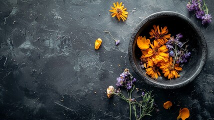 Herbs and flower tea mixture with yellow petals on textured black surface for natural wellness background