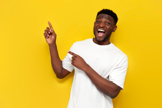 happy african american man in white t-shirt points with his hands to the side on yellow isolated background