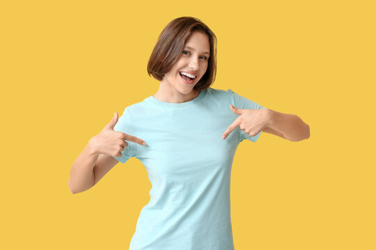Young woman pointing at her blank t-shirt on yellow background