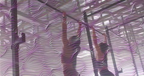 Two women practicing pole dance and fitness moves in studio with purple overlay, sunlight