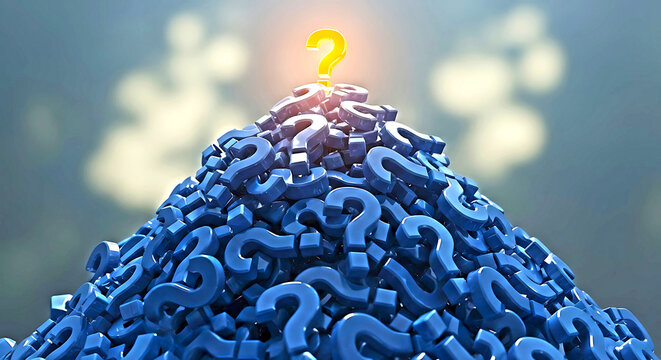 A towering mountain of blue question marks culminates in a single glowing yellow question mark symbolizing the ultimate answer or solution