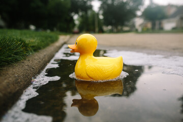 large yellow rubber duck floating in puddle