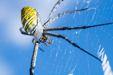 Yellow orb weaver spider spinning intricate web on sunlit green background close-up macro