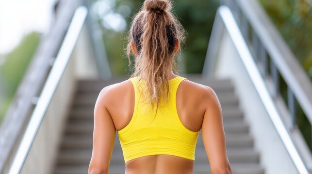 Woman stretching on balcony yoga mat with yellow energy overlay, outdoor fitness wellness