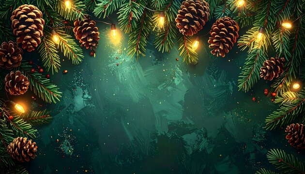 Christmas border with pine branches, pinecones, warm yellow string lights on dark green textured background.