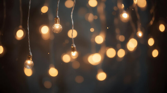 Amber globe string lights hanging against textured wall glowing filament bokeh ambience