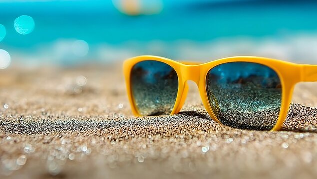 Close-up of yellow sunglasses on the sand with a blurred blue sea in the background. Summer