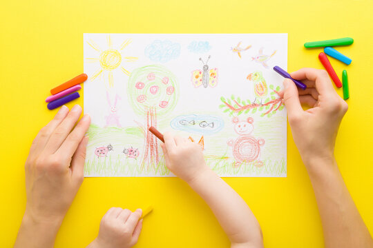 Mother and baby hands holding wax crayons and drawing colorful draw on paper on yellow table background. Playing and spending time together. Toddler development. Point of view shot. Closeup. Top view.
