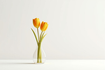 minimalistic flower composition. yellow tulip in a vase on a white background, space for a text